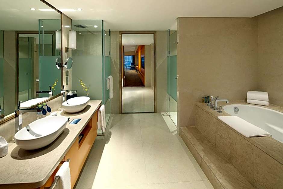 Twin-sharing room features bathroom and walk-in closet area, a 42-inch flat-screen TV, tea and coffee making facilities, mini-bar and complimentary mineral water. This bright and airy room has large windows with Yangtze River view or Garden view.